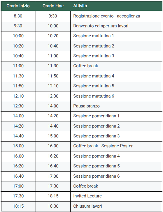 Il Meeting si svolgerà interamente nella giornata di sabato 8 novembre con orario dalle 08:30 alle 18:30.